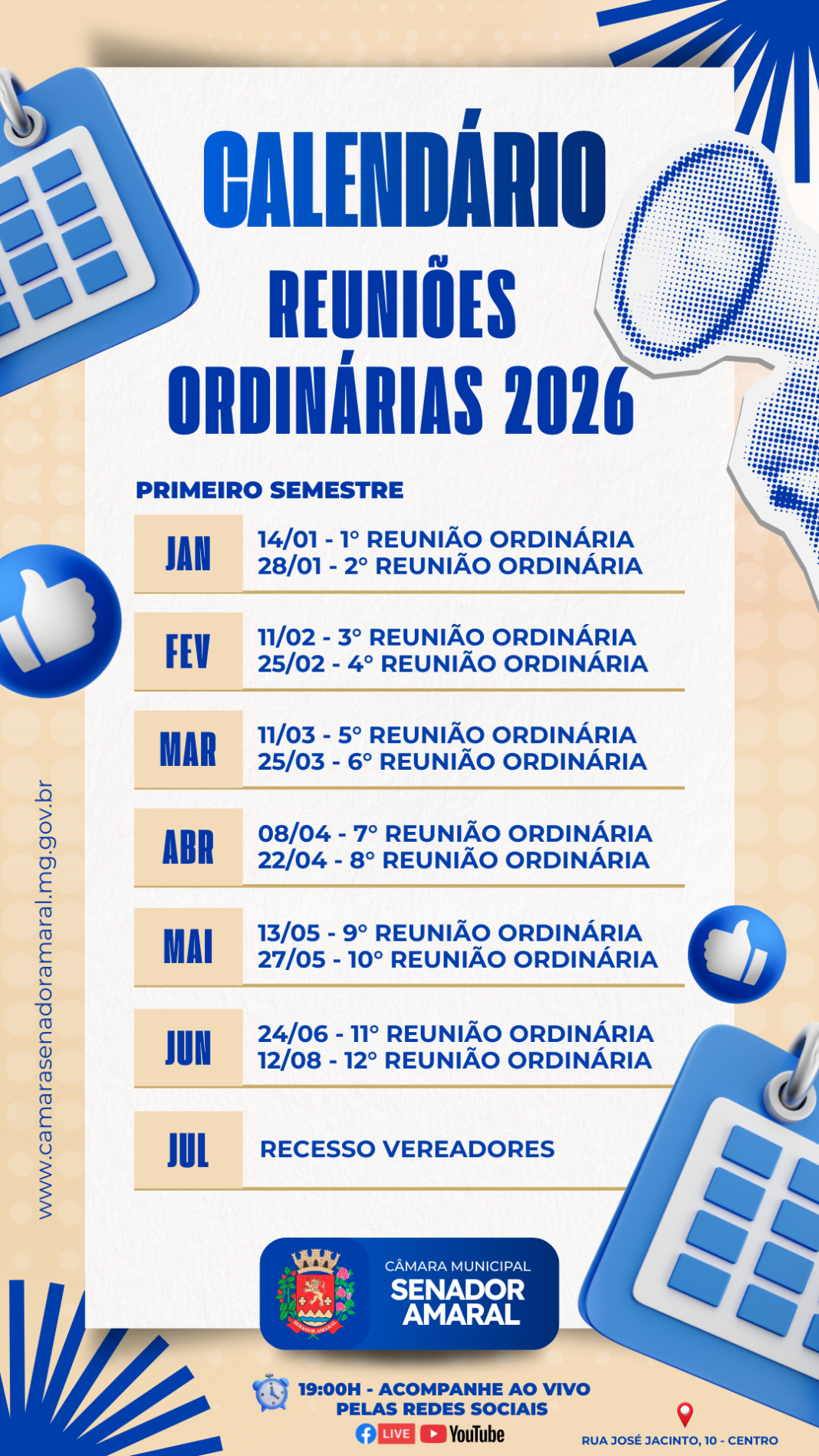 A Câmara Municipal de Senador Amaral divulga as datas das Reuniões Ordinárias que serão realizadas no primeiro semestre de 2026.