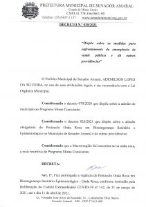 Seguindo as orientações adoção obrigatória do protocolo Onda Roxa em Biossegurança Sanitária e Epidemiológica no Município de Senador Amaral.